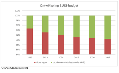 Als we naar de ontwikkeling van het BUIG-budget kijken, dan zien we voor de komende periode een licht stijgende lijn als geheel met een verschuiving naar een hoger aandeel LKS ten laste van de uitkeringscomponent. Onderstaande grafiek laat procentueel de ontwikkeling zien: